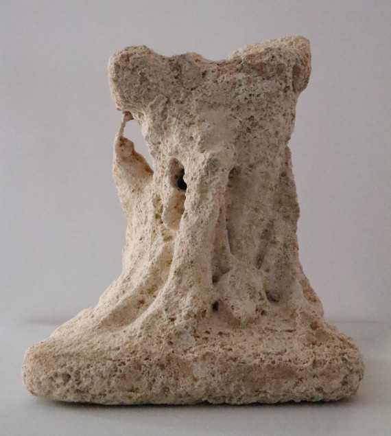 Das Bruchstück besteht aus gelbgrauem unreinem Kalkstein. Von dem Inschriftfeld ist noch ein Teil des rechten Bereichs mit fünf Textzeilen und der Rahmung erhalten.